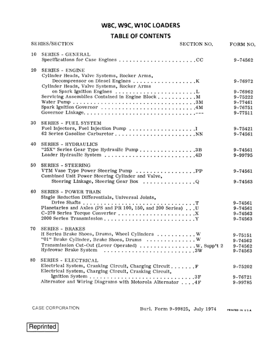 Case W8, W9, W10 Wheel Loader Pdf Repair Service Manual (Pb. No. 9-99965)