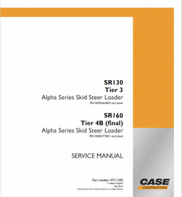 Case SR130, SR160 Skid Steer Loader Pdf Repair Service Manual (publ. Nb. 47711585) (Alpha Series 2014 Tier 3 & Tier 4b (final)) EU