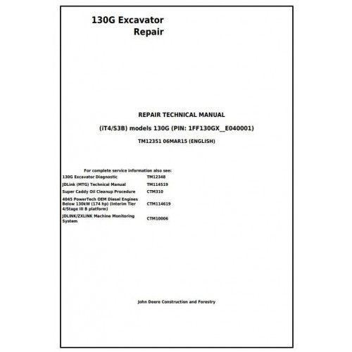 It is Factory Service Repair Manual for John Deere (iT4/S3B) Excavator 130G