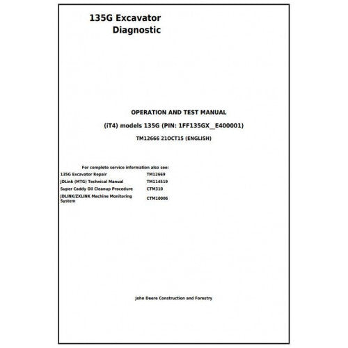 It is Factory Diagnostic, Operation and Test Service Manual for John Deere PIN: 1FF135GX__E400001 (iT4) Excavator 135G