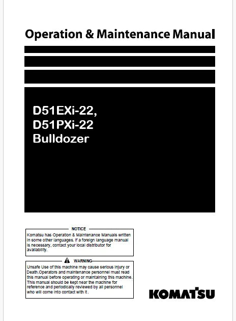 Get the most out of your Komatsu D51EXi-22, D51PXi-22 Bulldozer with this detailed, downloadable PDF Operator’s Manual. Designed for operators and maintenance teams, it offers everything you need to operate, maintain, and troubleshoot your machine efficiently.