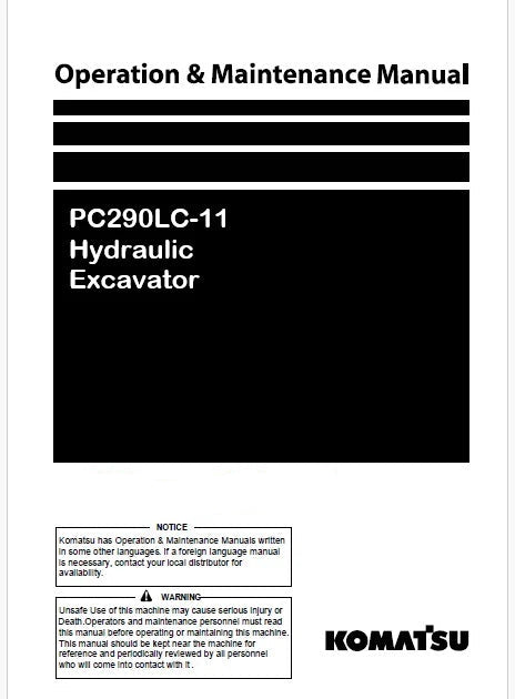 The Komatsu PC290LC-11 Hydraulic Excavator is a versatile, high-performance machine built for demanding tasks in construction, landscaping, and excavation. Its advanced hydraulic system and robust engine require proper operation and maintenance to ensure reliability and efficiency. This manual empowers you to: