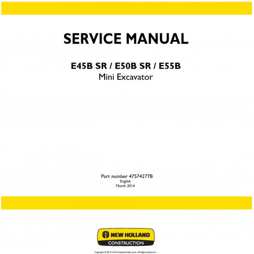 New Holland E45B SR, E50B SR, E55B Mini Excavator Pdf Repair Service Manual (p. Nb. 47574277b) 2014