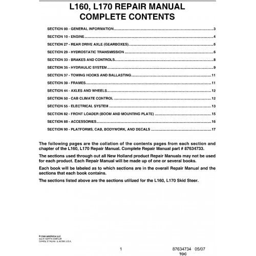 New Holland L160, L170 Skid Steer Loader Pdf Repair Service Manual (p. Nb. 87634733NA)