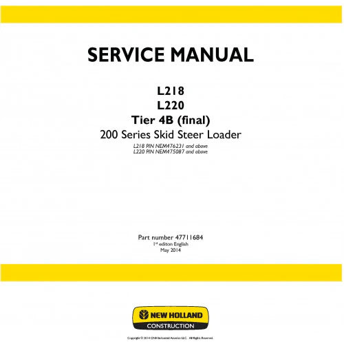New Holland L218, L220 Skid Steer Loader 200 Series Pdf Repair Service Manual (P. Nb. 47711684) (Tier 4b (final))