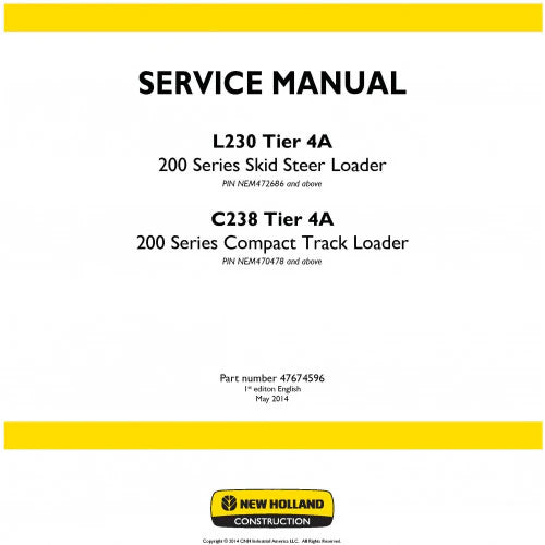 New Holland L230 Skid Steer Loader and C238 Compact Track Loader Pdf Repair Service Manual Eu (P. Nb. 47674596)