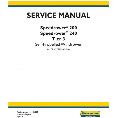 New Holland Speedrower 200, Speedrower 240 Self-propelled Windrower Pdf Repair Service Manual (p. Nb. 48126539) (Pin Ygg677501 And Above) Tier 3