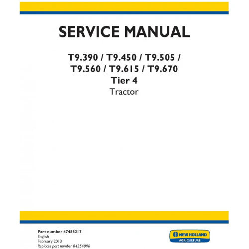 New Holland T9.390, T9.450, T9.505, T9.560, T9.615, T9.670 Tractor Pdf Repair Service Manual (TIER 4)