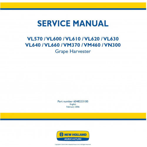 New Holland VL570, VL600, VL610, VL620, VL630, VL640, VL660, VM370, VM460, VN300 Grape Harvester Pdf Repair Service Manual (p. Nb. 6048233100)