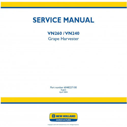 Introducing the Instant Buy and Instant Download New Holland VN240, VN260 Grape Harvester Pdf Repair Service Manual for easily service and repair your New Holland equipment. This manual is packed with clear diagrams and detailed information about part of your New Holland machinery and step by step instructions how to service and repair your New Holland machinery very easily that will help you a lots.